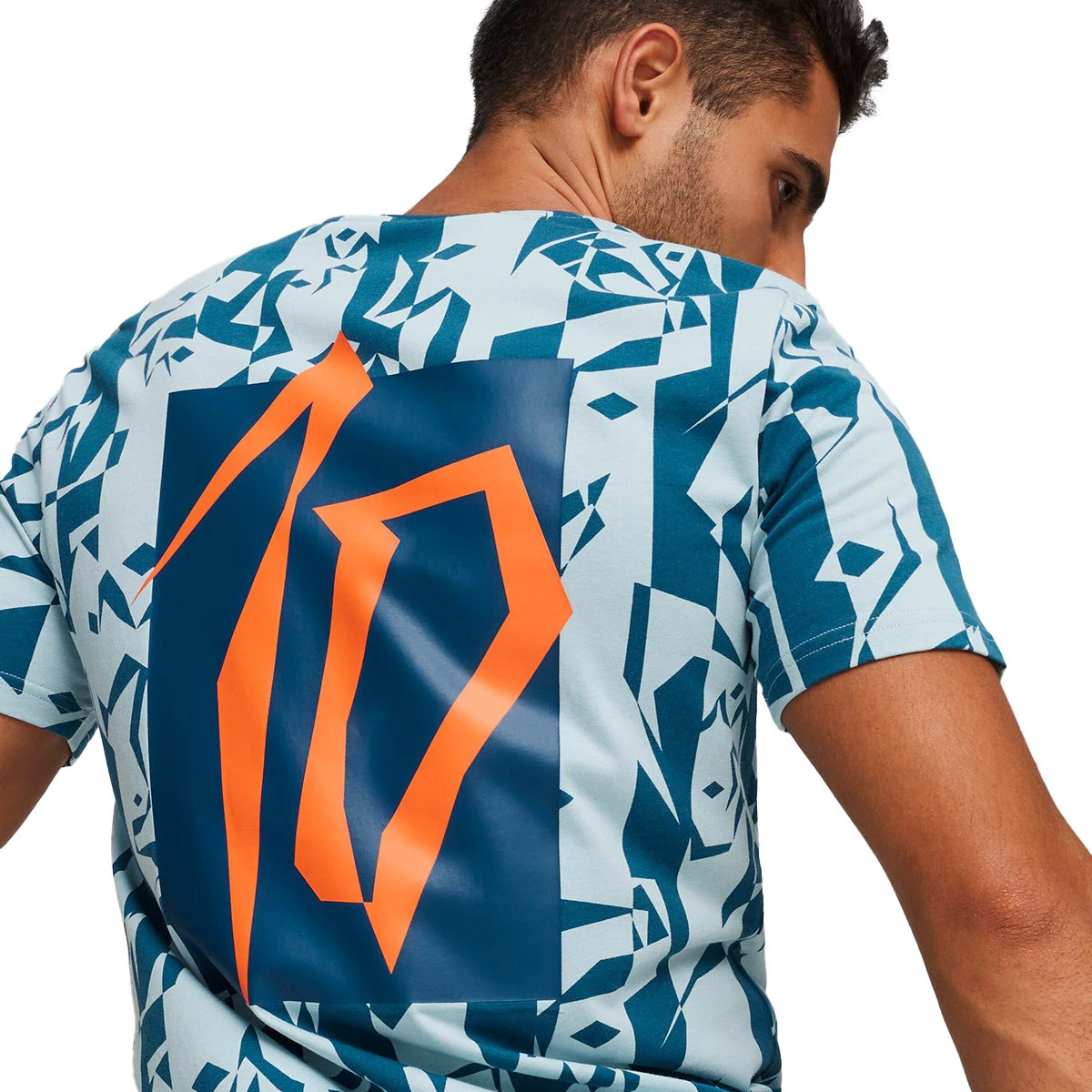 Neymar et Puma nous ramènent l'un de leurs classiques avec ce t-shirt Creativity Pack. Les couleurs principales sont le bleu, le blanc et l'orange.