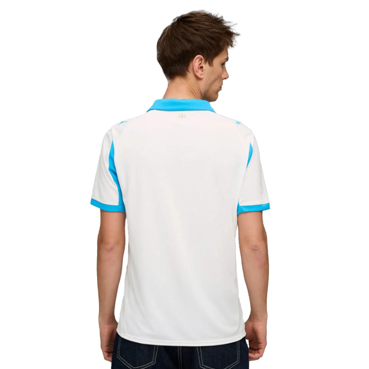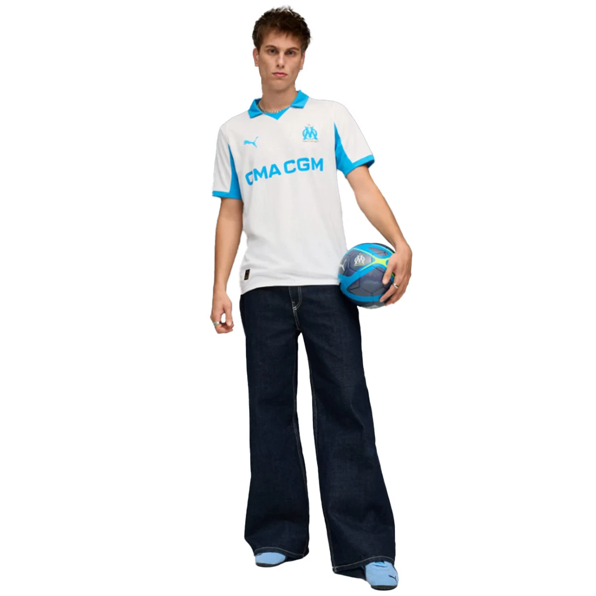 Affichez votre soutien à l’Olympique de Marseille avec le maillot officiel domicile 25/26. Il présente un design classique et épuré avec une palette de couleurs majoritairement blanche rehaussée de détails bleu clair. Le col et les poignets ajoutent une touche d’élégance, tandis que le logo du félin de PUMA et l’écusson du club se distinguent fièrement sur la poitrine.