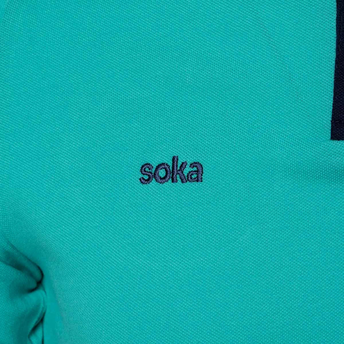 Polo officiel SD Huesca 2024-2025 de Soka pour enfant en  Turquoise-Storm Blue d'orage. Vous pourrez vous habiller comme les joueurs de l'équipe aragonaise lors de leurs déplacements au stade et afficher votre soutien au club de Huesca.