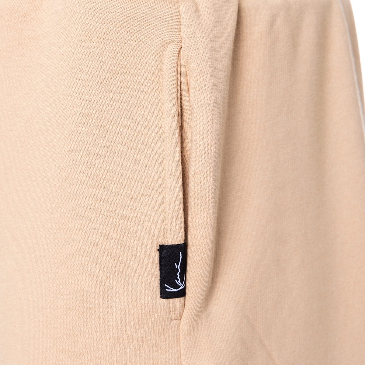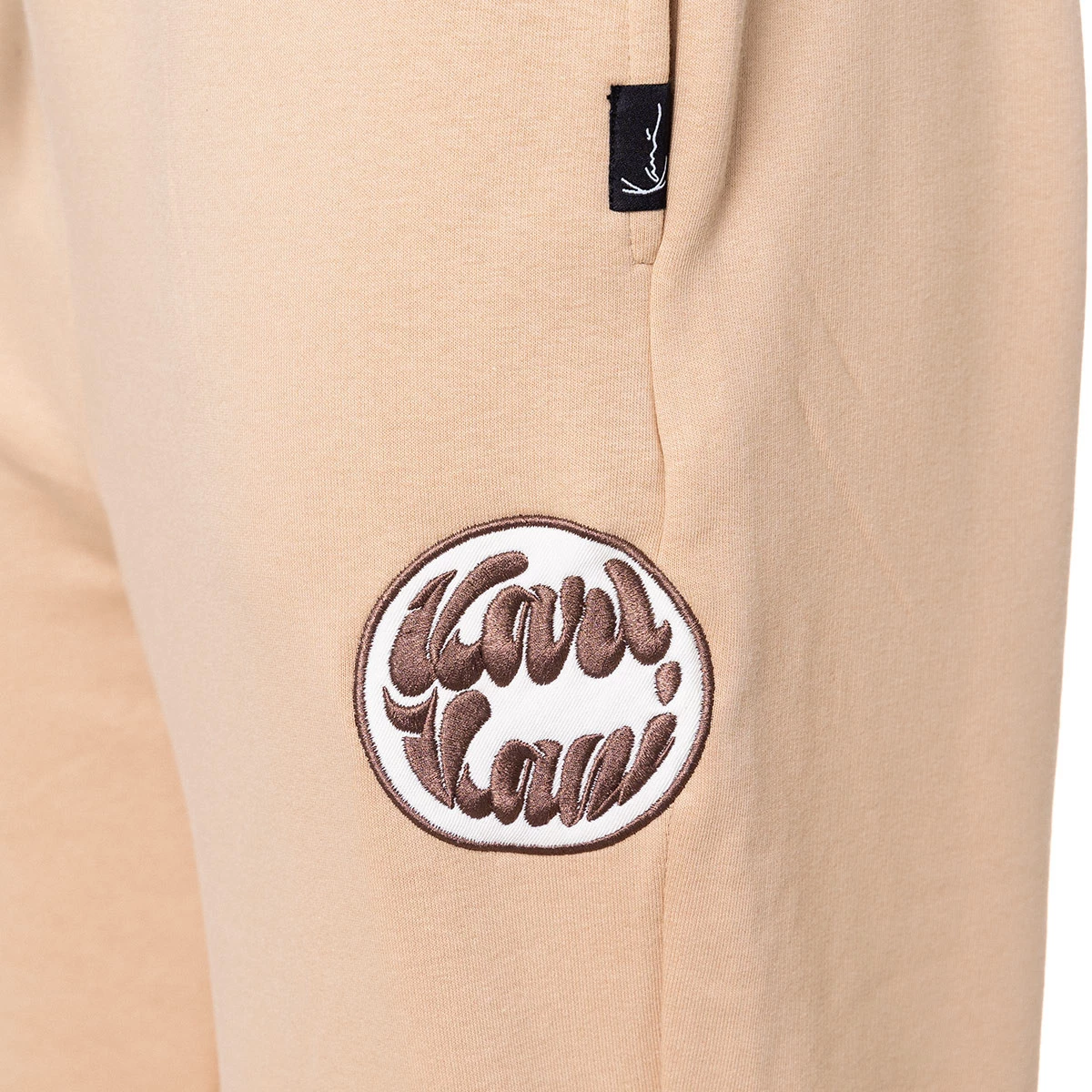 Pantalon de sport Karl Kani beige. Pantalon confortable de style rétro avec poches latérales et taille caoutchoutée avec cordon de serrage pour un ajustement optimal.