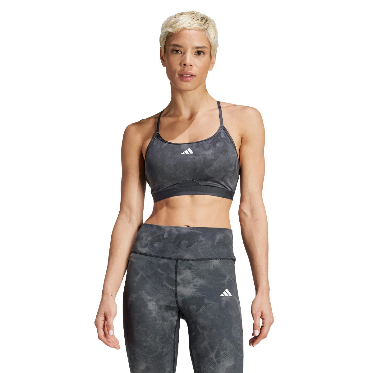 Ce soutien-gorge de sport adidas léger présente un imprimé floral d'inspiration tie-dye pour un style contemporain. Elle est dotée d'une bretelle fine et de la technologie respirante AEROREADY qui garde la peau sèche pendant les séances de yoga et les cours de barre. Les points antidérapants sur les bonnets amovibles empêchent les bonnets de glisser.