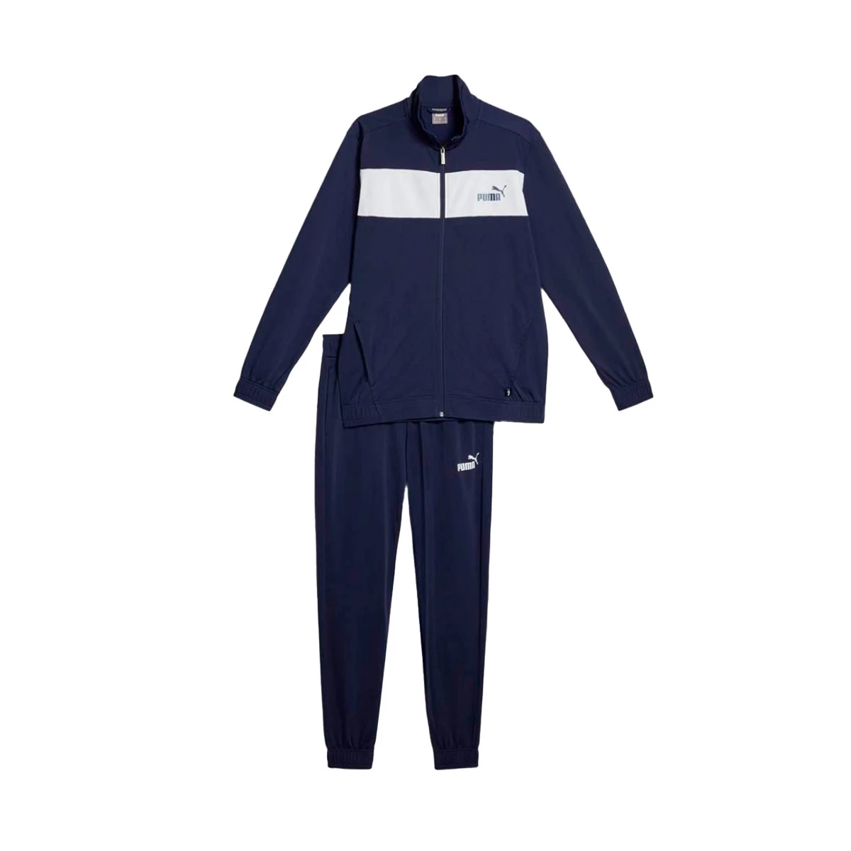 Survêtement Puma Poly en Navy. Un vêtement parfait pour pratiquer le sport de manière confortable et sûre. Veste et pantalon de coupe standard avec fermeture à glissière intégrale. Veste avec coutures latérales avant, poignets et ceinture élastiques.