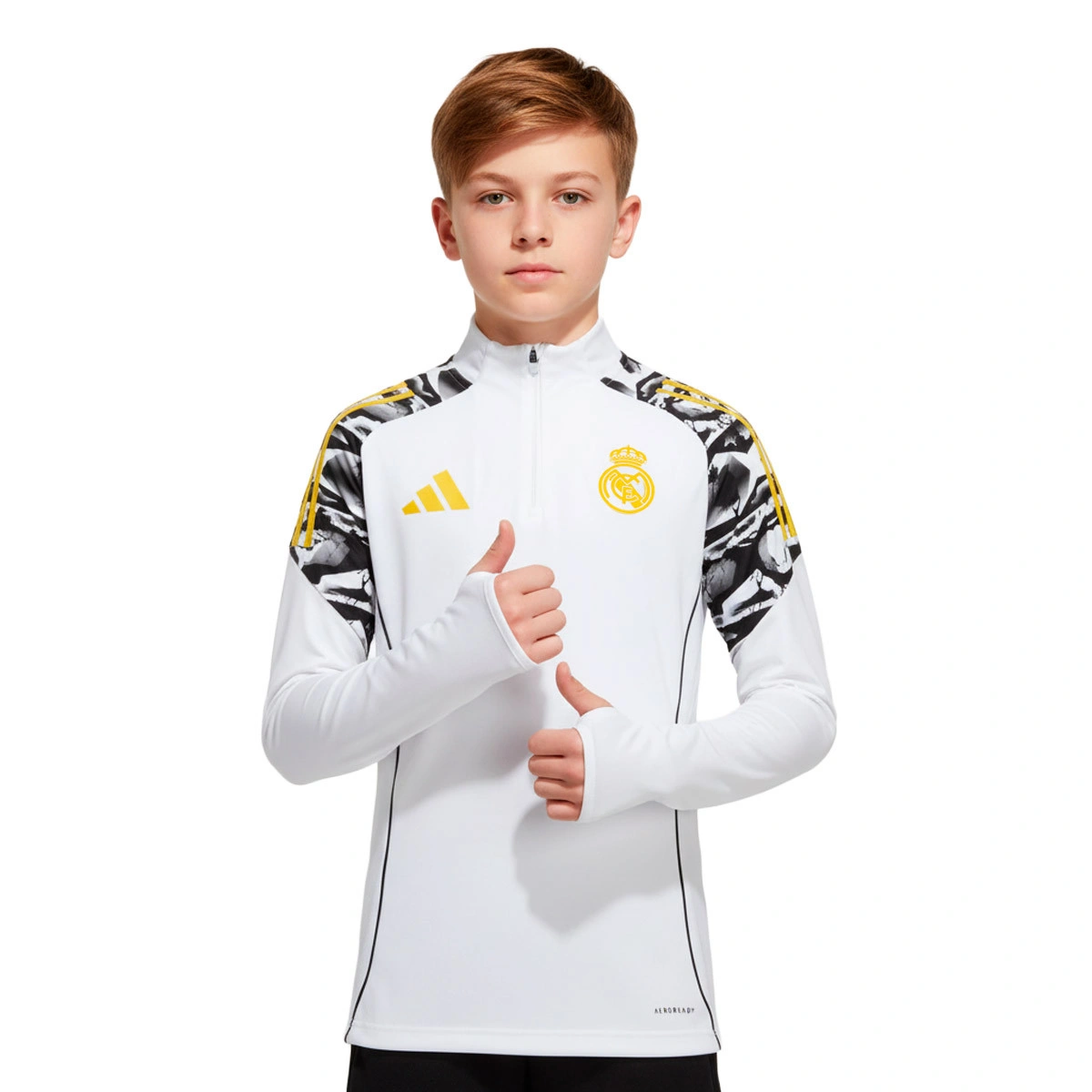 Grâce à sa structure respirante, la peau reste sèche et te permet de te concentrer sur ton jeu sans distractions. La capuche protectrice avec fermeture éclair augmente le confort et prévient l'apparition d'irritations. Son design élégant est complété par le logo iconique adidas et l'écusson du Real Madrid pour que tu te démarques avec style dans n'importe quel stade.
