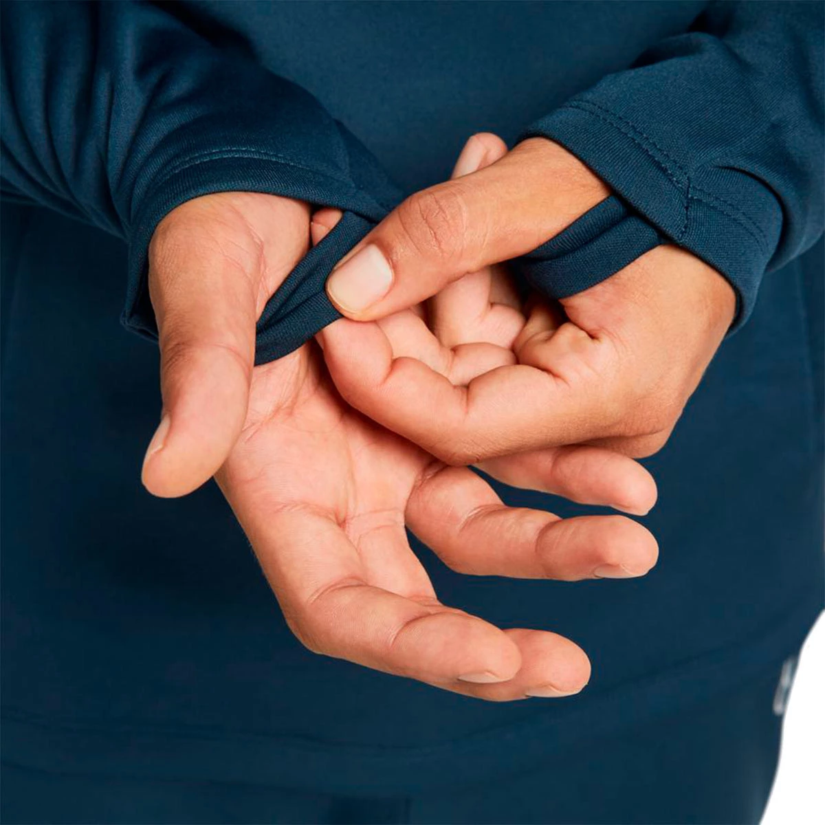 Ouvertures de pouce invisibles pour garder les manches en place pendant que vous vous déplacez, avec la possibilité de les cacher de manière impeccable lorsqu’ils ne sont pas portés.