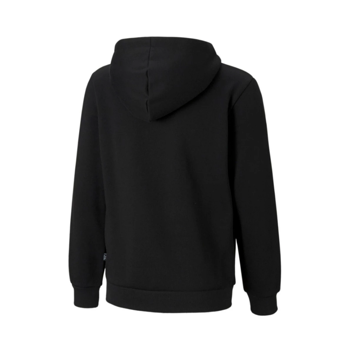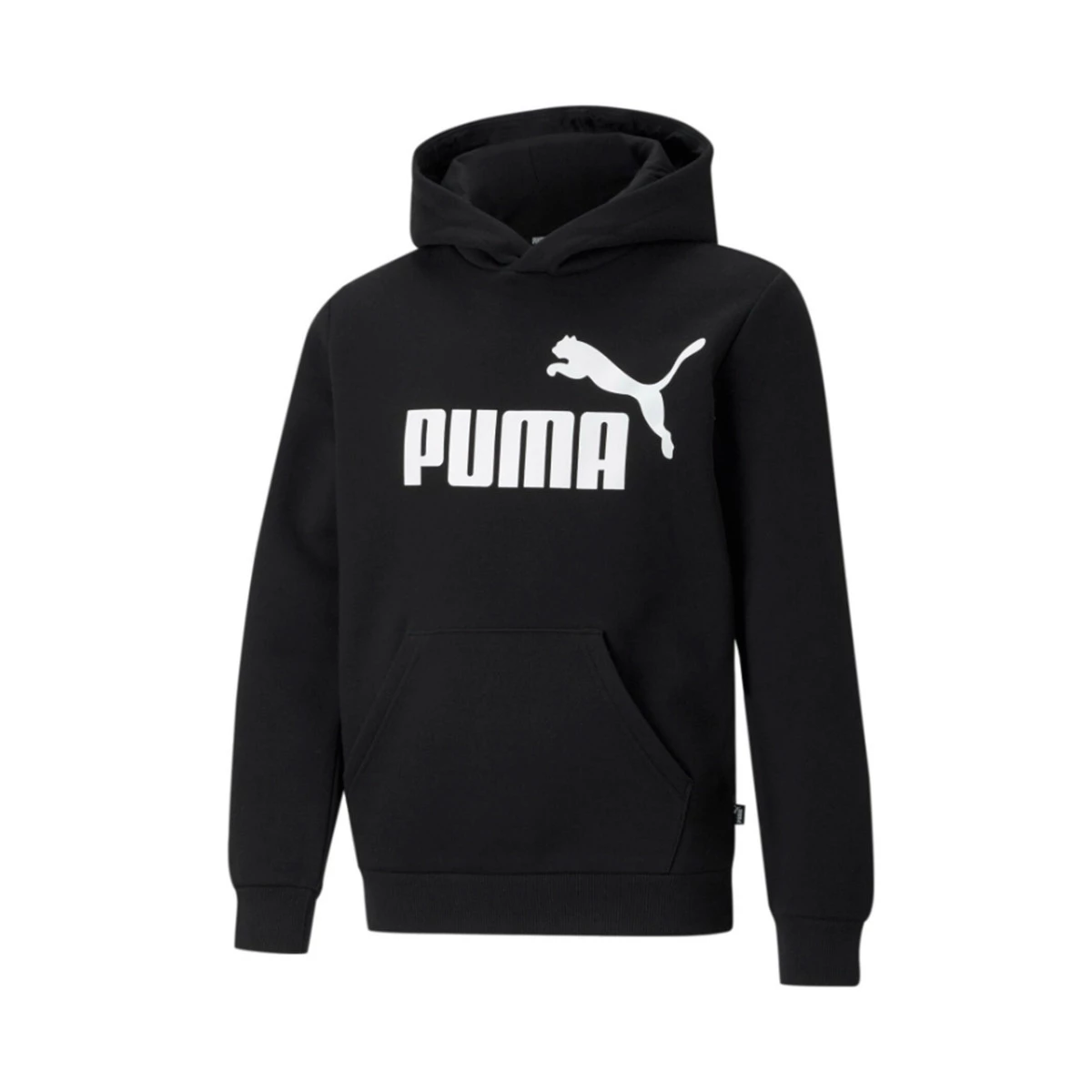 Sweat Essentials Big Logo pour garçon de la marque Puma, parfait pour les journées fraîches. Le vêtement possède une capuche, une poche kangourou à l'avant et le logo de la marque au centre de la poitrine.