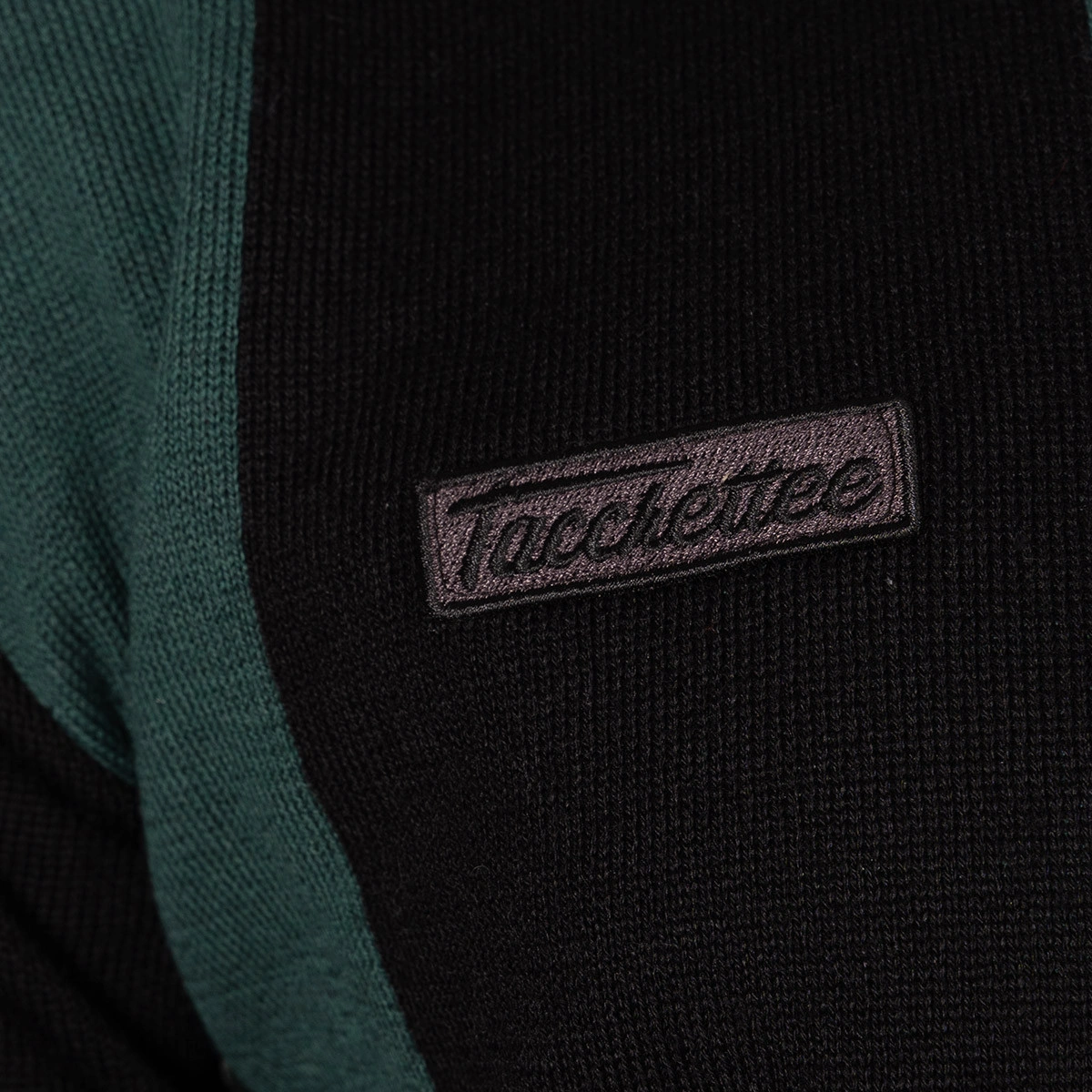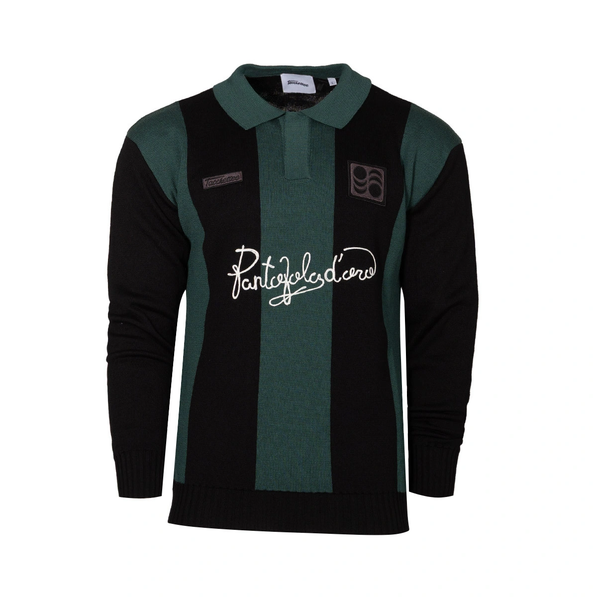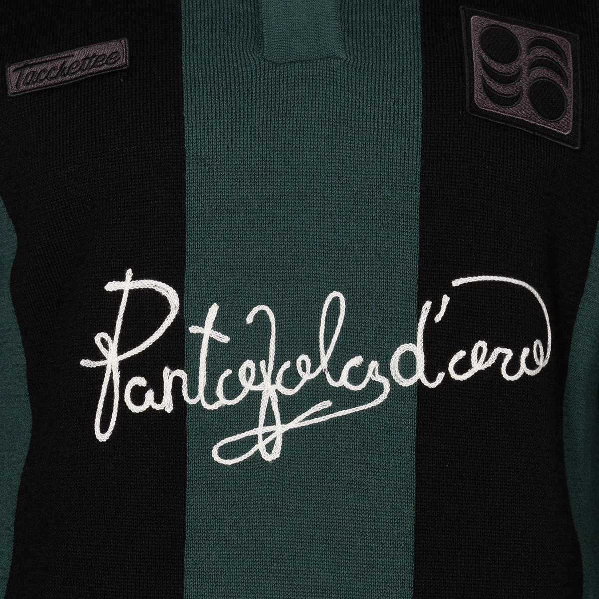 Fabriqué en tricot jacquard doux, il alterne des rayures verticales vertes et noires pour un design classique et durable. Le logo brodé 'Pantofola d'Oro' et l'écusson Tacchettee ressortent sur la poitrine, scellant une collaboration qui unit deux mondes liés par la même passion.