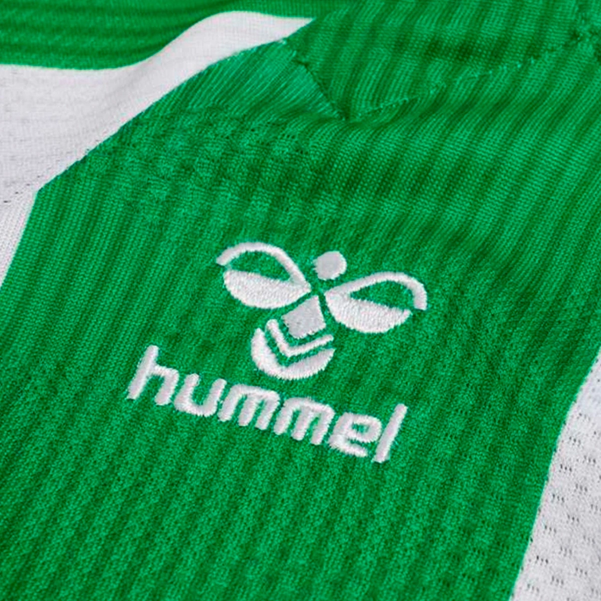 Fabriqué dans un tissu jacquard léger et résistant, il comporte des détails brodés sur l'écusson et le logo, avec une touche rétro. À l'intérieur du col, le message « Verde, verde como el equipo de mi ciudad » rend hommage à la célèbre chanson de María Jiménez. La tenue est complétée par un short noir et des chaussettes vertes, comme dans les moments historiques du club.