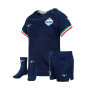 Tenues Lazio Away pour bébés de la saison 2023-2024. Le design de la seconde tenue de Mizuno est inspiré du drapeau italien et de la célébration du 50e anniversaire du premier Scudetto de la Latium. Cela se reflète dans les bandes en relief sur le devant du maillot et les bandes sur le bord des poignets. Le coloris bleu marine audacieux reflète la force et la puissance du club pour la saison à venir en Ligue des Champions. Maillot, ensemble chaussettes courtes