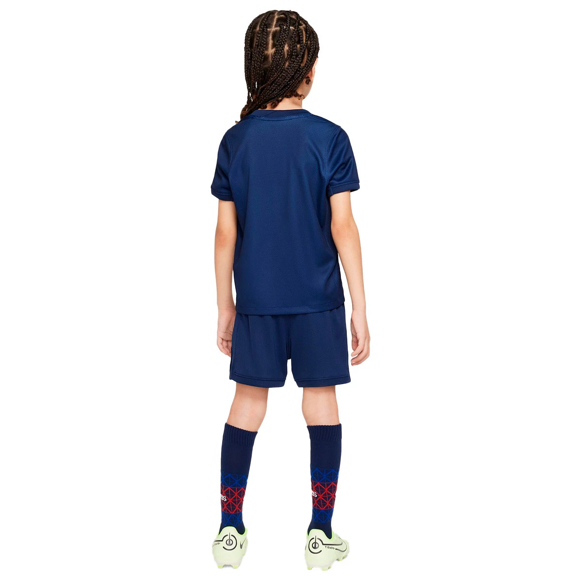 Cette tenue trois pièces, inspirée de celle portée par les professionnels sur le terrain, comprend un maillot, un short et des chaussettes assorties. Elle est confectionnée dans un tissu léger qui évacue la transpiration pour assurer le confort de votre jeune athlète pendant la course et le jeu.