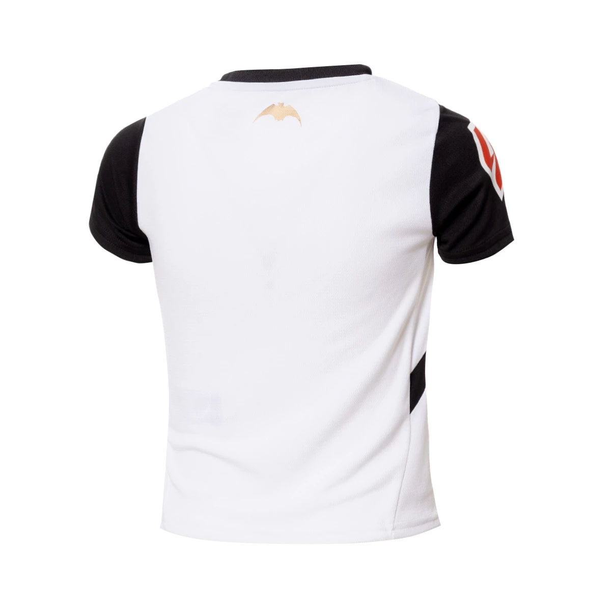 Le kit domicile du Valencia CF 2024-2025 pour enfants prend forme sous le slogan "Hagamos que birlle" (Faisons-le briller) pour raviver l'esprit, l'audace et la passion de se donner à fond. Le design est conçu comme un élément de fierté pour les joueurs et les supporters, avec les couleurs traditionnelles rehaussées de touches d'or sur l'écusson et d'autres éléments, symbolisant le succès obtenu avec l'inoubliable Triplé.