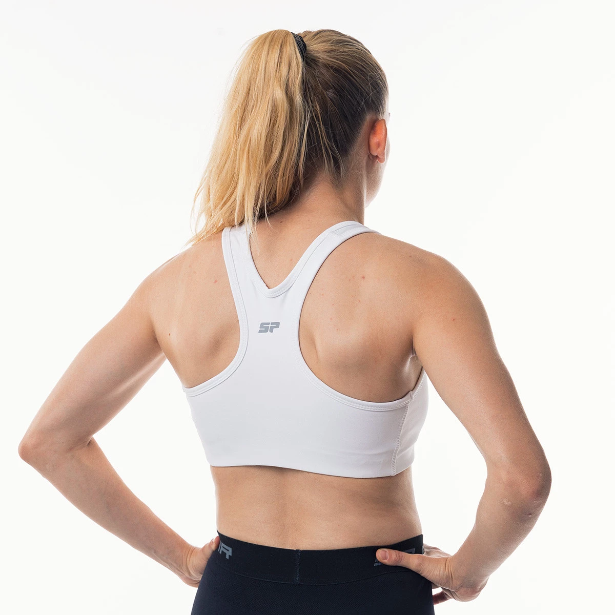 Soutien-gorge de sport, compressif avec bretelles larges et tissu en lycra.
