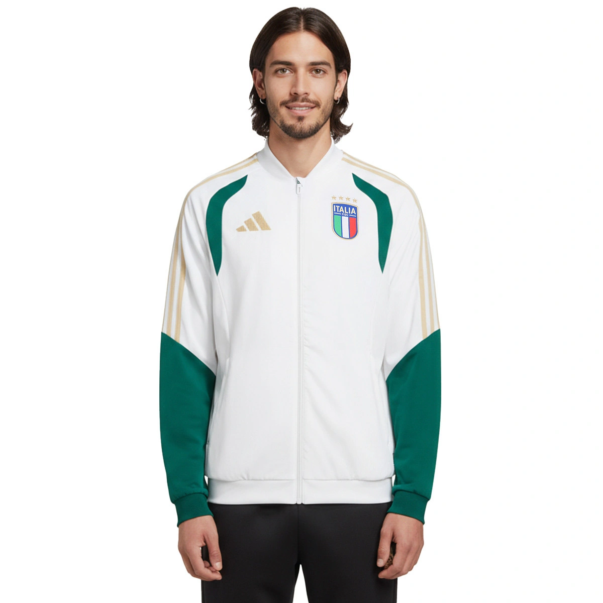 La tradition et la performance moderne se rejoignent avec cette veste pre-match adidas de la sélection italienne pour la Coupe du Monde 2026. Cette veste, inspirée par l'élégance du football italien, rend hommage à la célébration et à l'importance du sport.