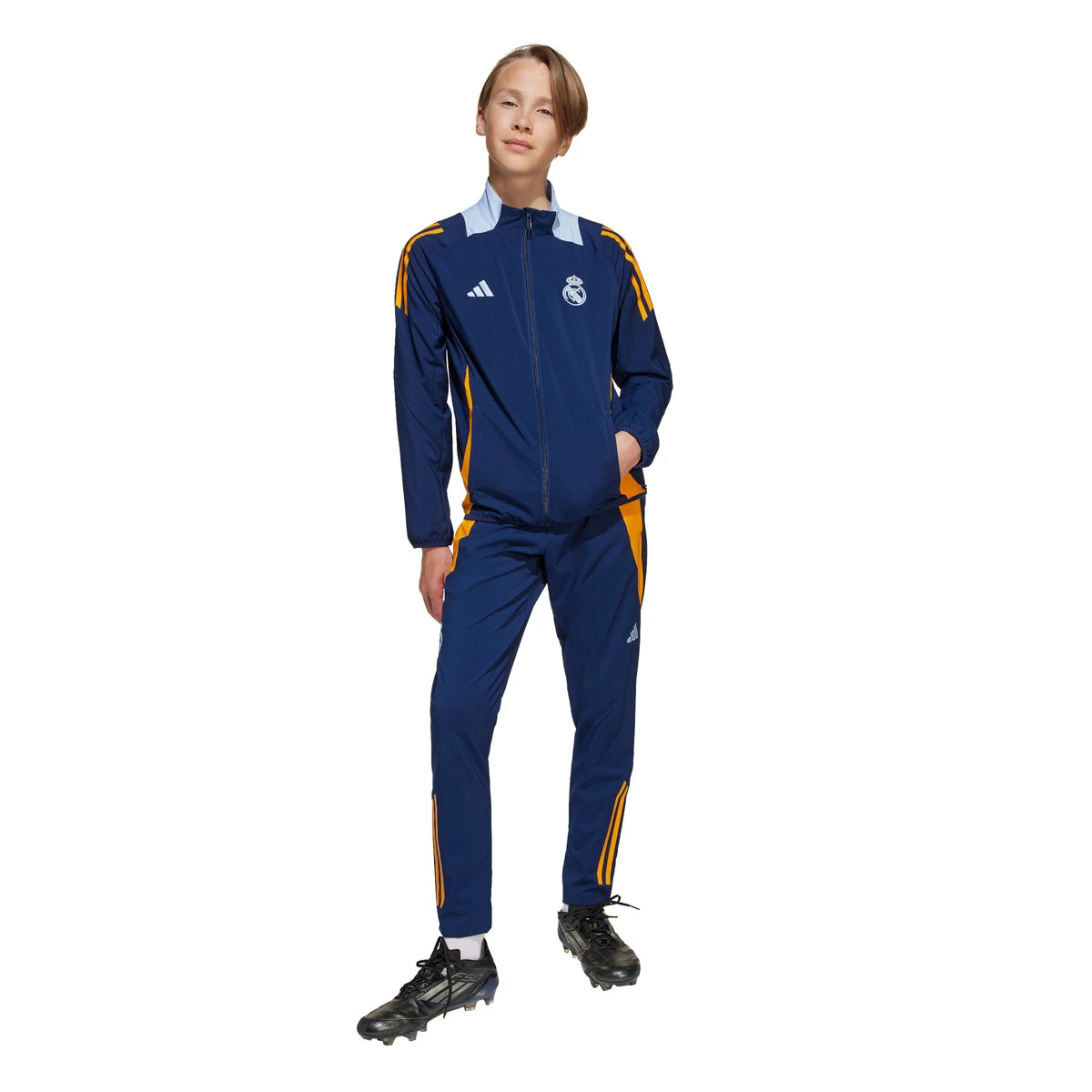 Veste d'avant-match 2024-2025 du Real Madrid pour enfant. Affiche ton allégeance au Real Madrid avec cette veste adidas pour jeunes fans, inspirée de ce que les joueurs portent pour montrer leur solidarité en dehors du terrain. La technologie respirante AEROREADY garde la peau au sec pendant que tu soutiens sans réserve aux Blancos.