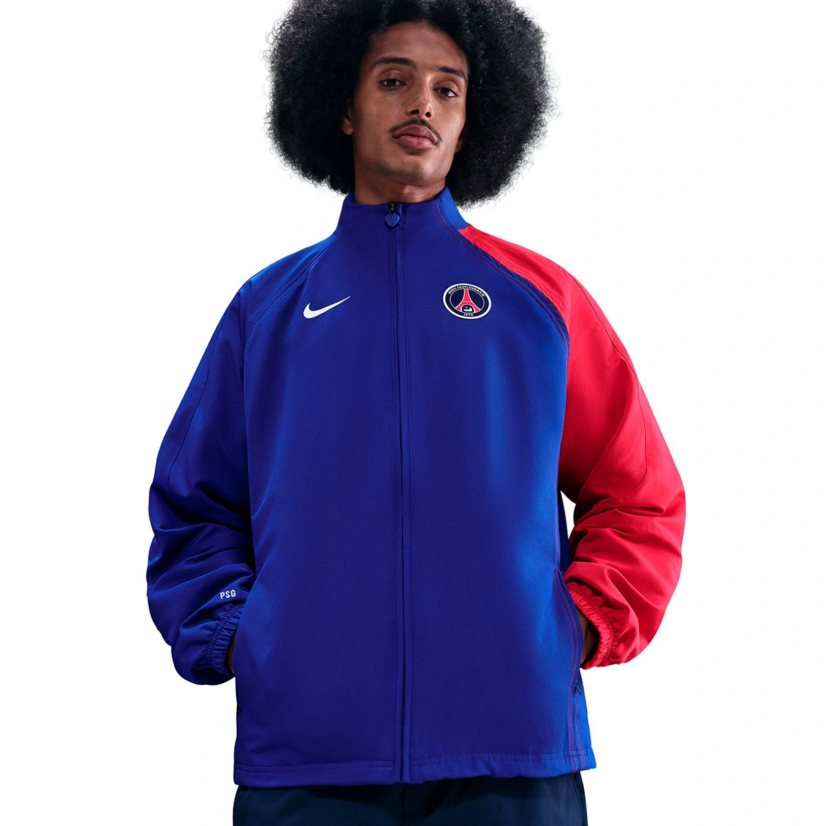 Cette veste rééditée semble tout droit sortie des archives. Avec ses couleurs, ses logos et ses détails vintage caractéristiques, cette nouvelle version rend hommage à la collection Total 90 créée par Nike pour l'équipe du PSG en 2004.