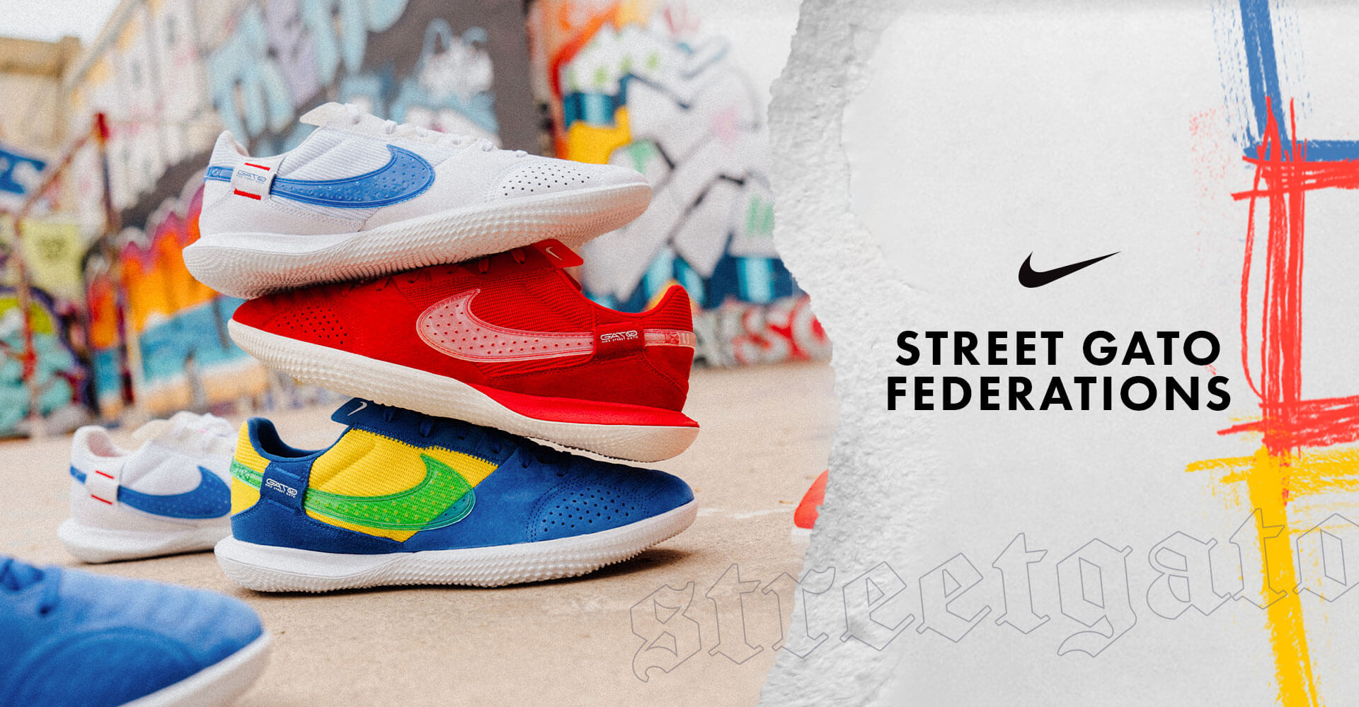Une nouvelle façon de voir le futsal. D'où la passion pour notre sport est née, LA RUE. La fusion parfaite de deux philosophies : les courts intérieurs et extérieurs. Une chaussure polyvalente. Street Gato Federations habille le modèle révolutionnaire de Nike aux couleurs des trois nations les plus puissantes soutenues par la firme américaine : le Brésil, la France et l'Angleterre. Découvrez tous les secrets de la collection !